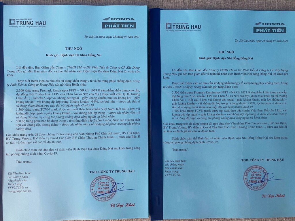 – Dong Nai Pediatric Hospital: 4,000 N95 & TCVN standard masks.