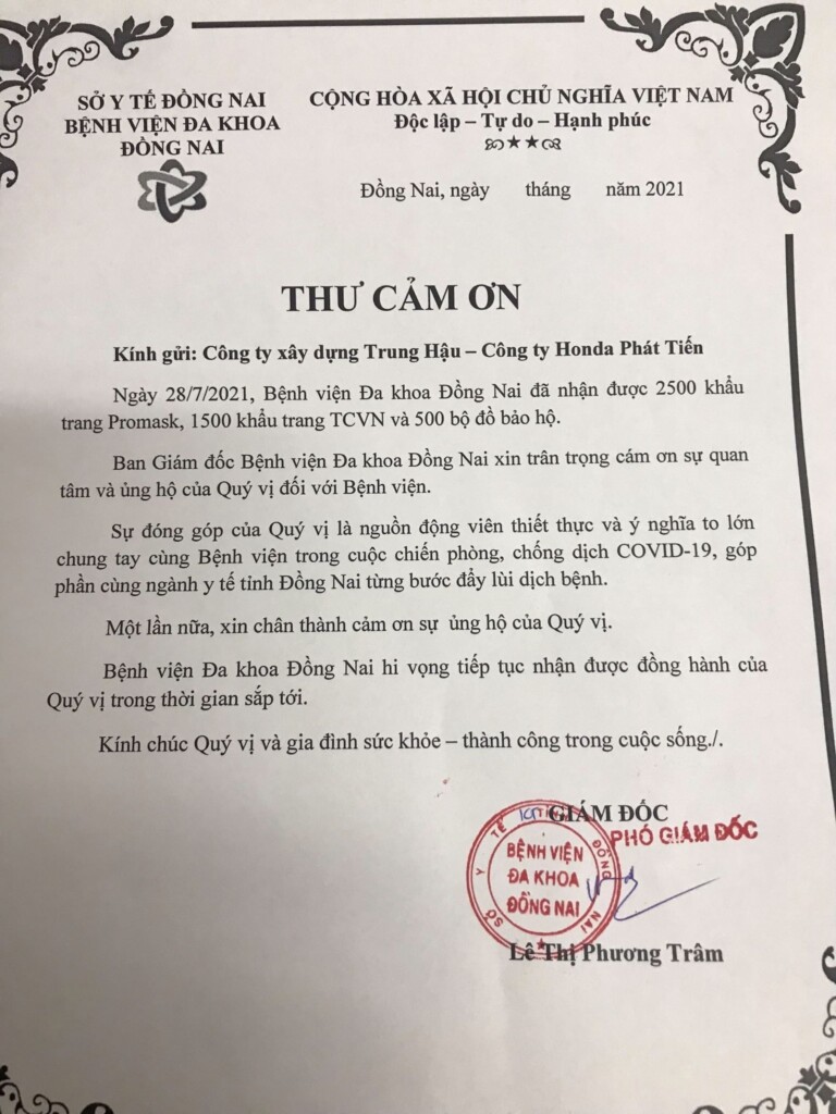 – Dong Nai General Hospital: 4,000 FFP2 & TCVN standard masks and 500 sets of epidemic prevention protective clothing.